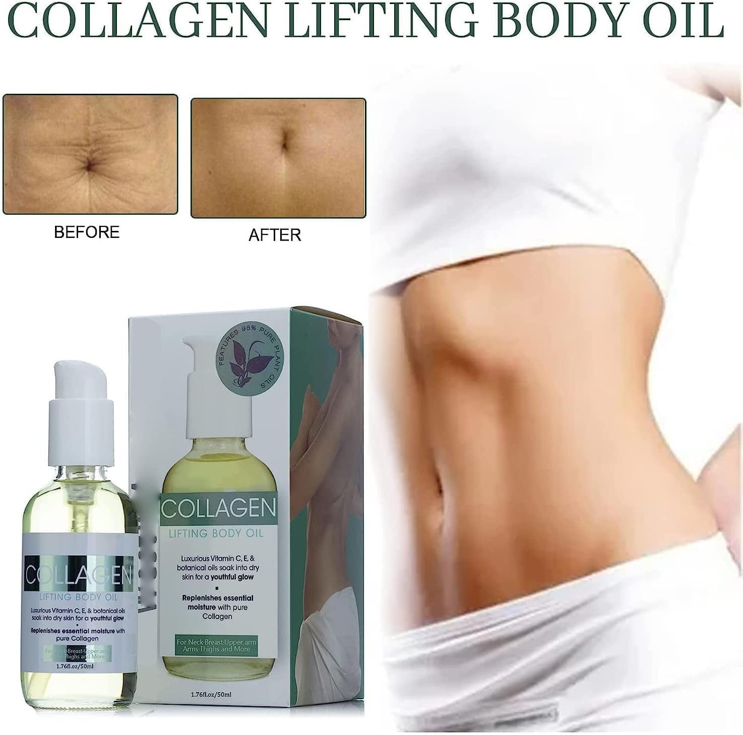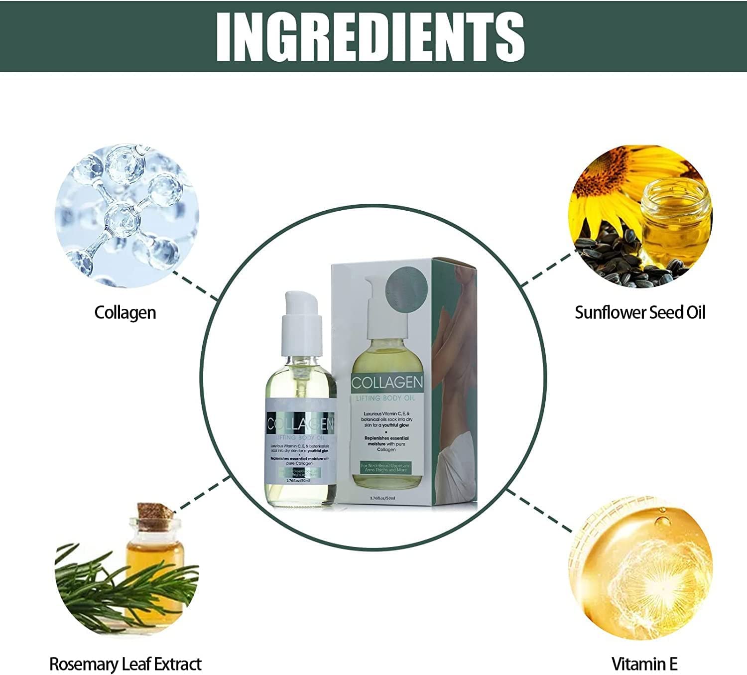 - Collagen lifting body oil: Collagen lifting body oil nourishes the appearance of lifted, youthful skin with lifting body oil. Your vitamin E oil helps to tighten and hydrate sluggish skin with clean ingredients, leaving skin smoother and softer.